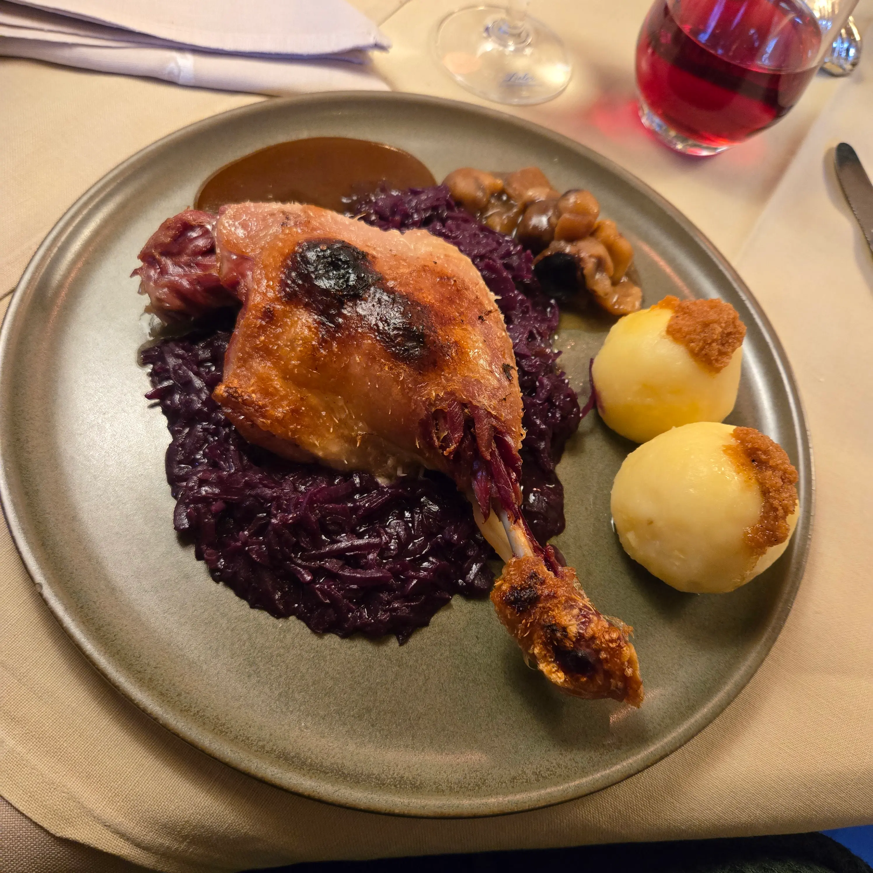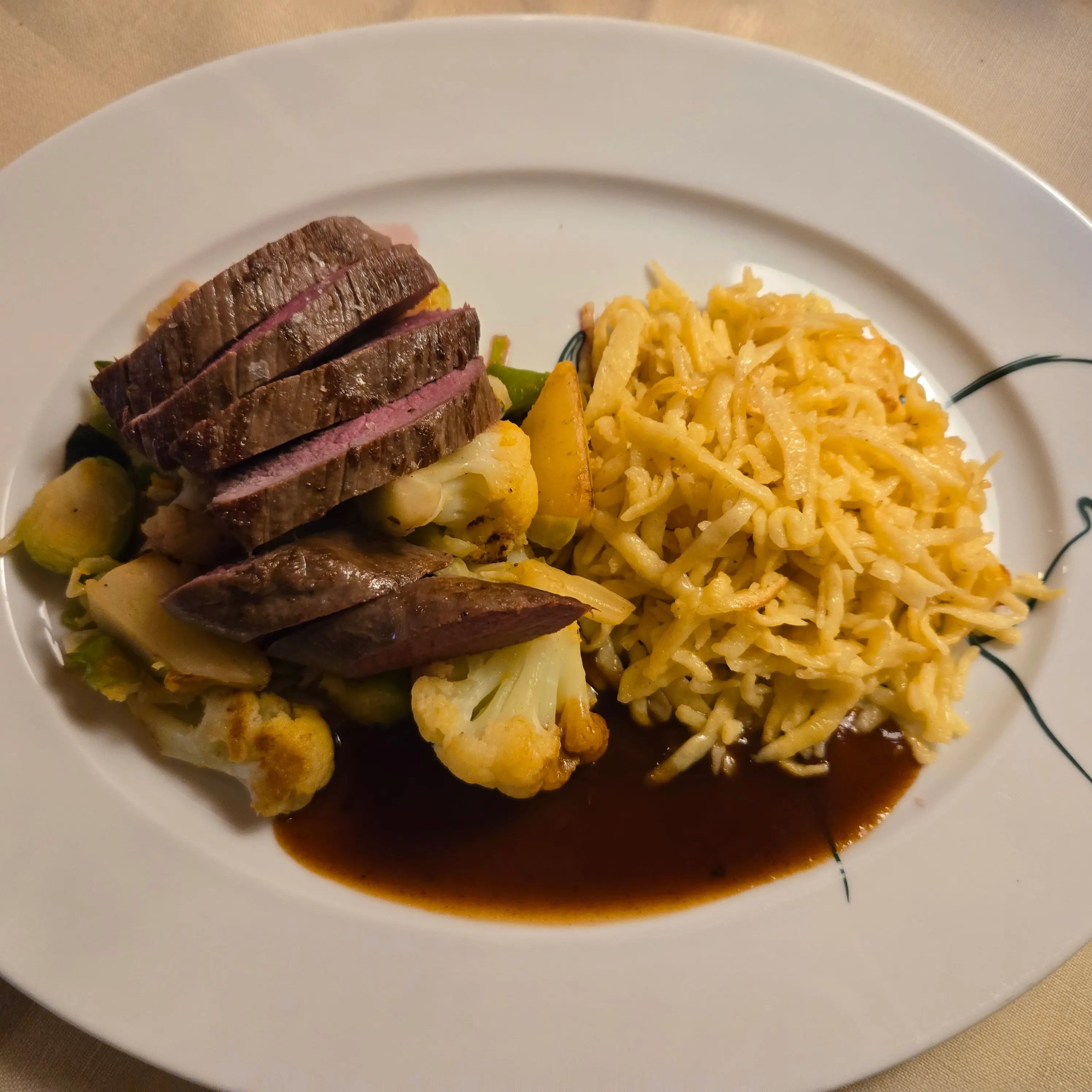 Unsere Gruppe hatte die Wahl aus einer sorgfältig zusammengestellten Abendkarte, die kreative und raffinierte Gerichte bot. Der "Kleine Gruß aus der Küche" begann mit einem köstlichen Zander auf der Haut gebraten, begleitet von kleinen Spinattortellini und Beurre Blanc oder hausgemachten Ricotta-Ravioli mit buntem Beetgemüse und Wildkräuterschaum. Als Hauptgang konnte man sich für die confierte Entenkeule mit Kartoffelknödeln, Rotkraut, Maronen und Entenjus entscheiden, oder die Münsterländer Rehnüssle aus der Keule, serviert mit hausgemachten Spätzle vom Brett, winterlichem Gemüse und Lindenbrunnenhof- und Preiselbeeren-Pfefferjus. Zum Abschluss wurde eine verführerische Schokoladentarte "Bertrand" mit Passionsfruchtsorbet und Mangoduxelle angeboten – ein perfektes Menü, das den lokalen Charakter und die kreative Kochkunst des Hauses vereinte.